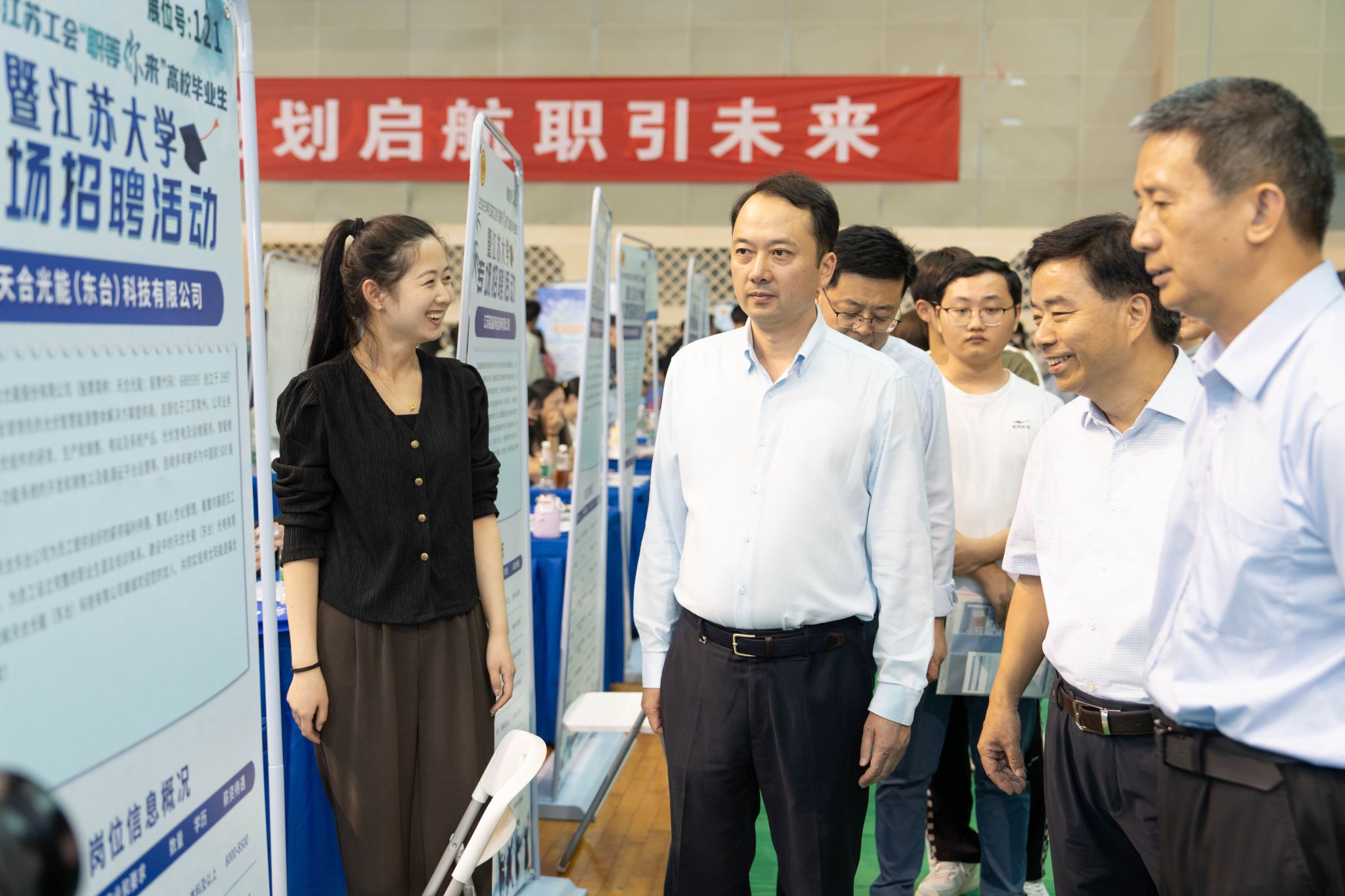 副校长任旭东、江苏省工会原副主席井良强现场走访调研参会企业单位,并与毕业生亲切交流。相关学院分管学生工作的党委副书记、毕业班辅导员走进招聘会现场,与学院学科相适配的企业主动对接交流。