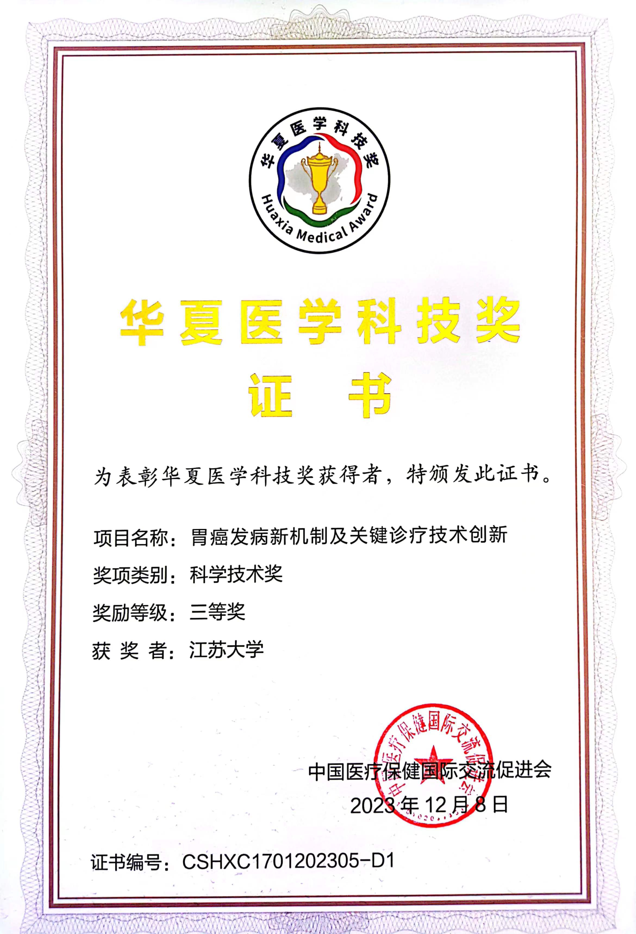 12月9日,2023年度华夏医学科技奖获奖名单正式公布。以开云网页版登录入口为第一完成单位、张徐教授为第一完成人的《胃癌发病新机制及关键诊疗技术创新》项目荣获华夏医学科技奖三等奖。