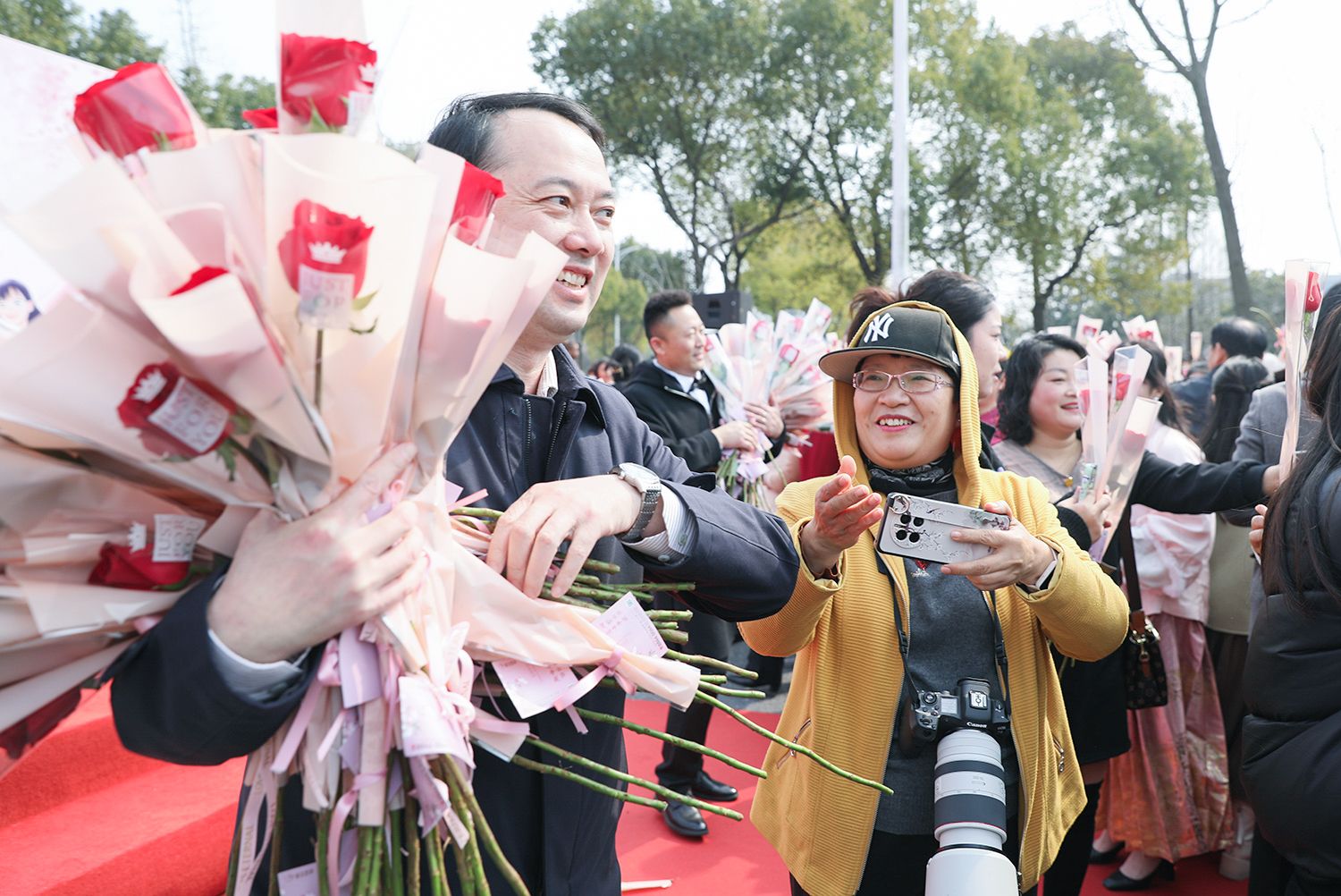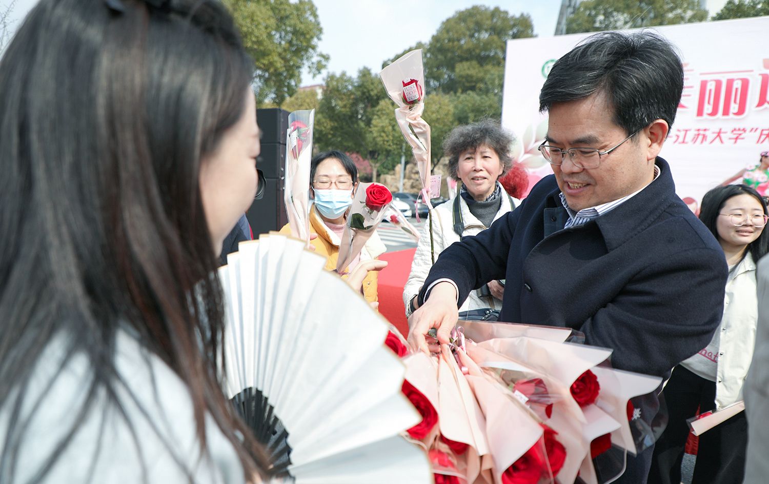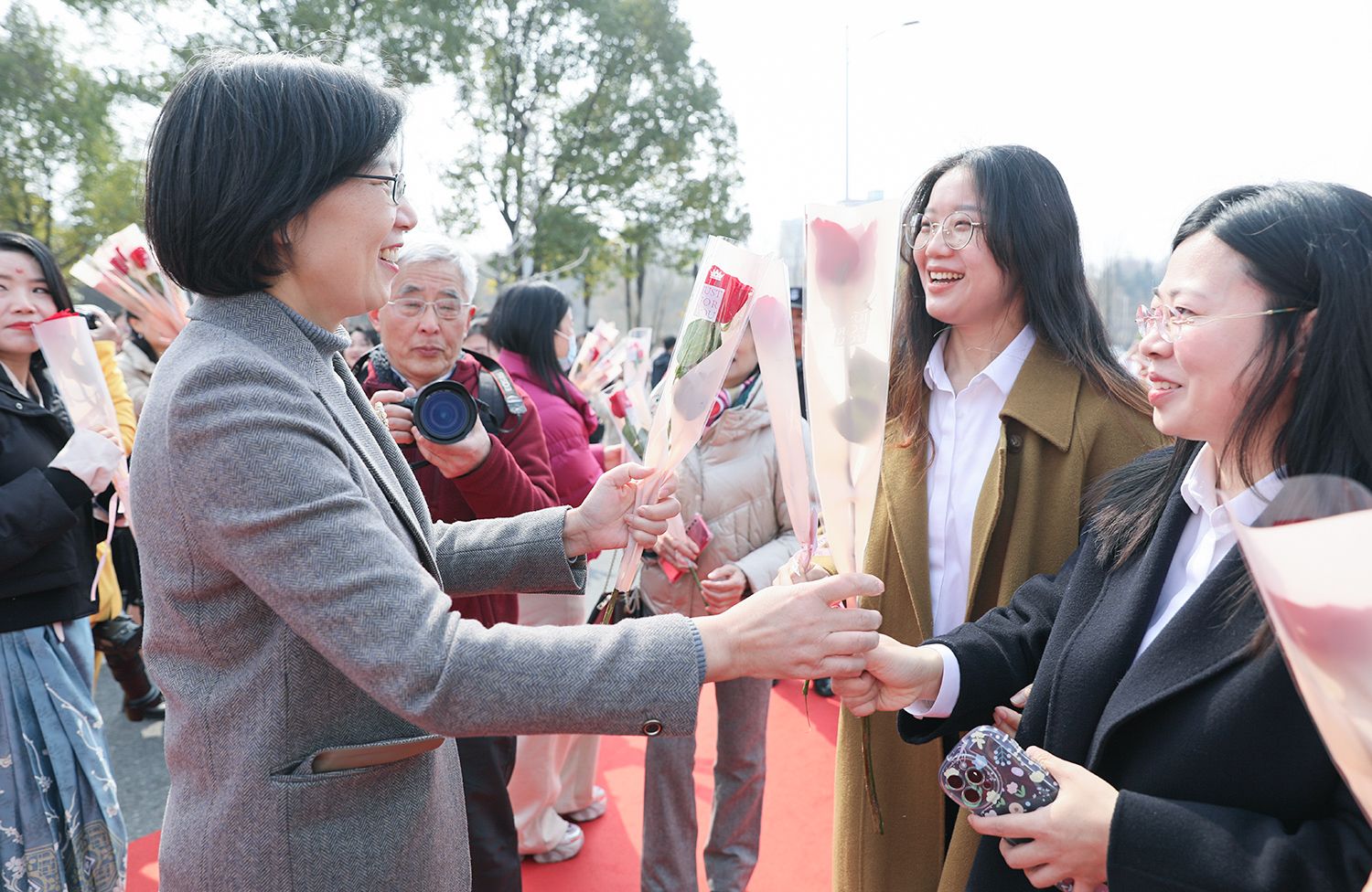 校领导来到女同胞当中,向她们送上美丽的鲜花和节日的祝福。