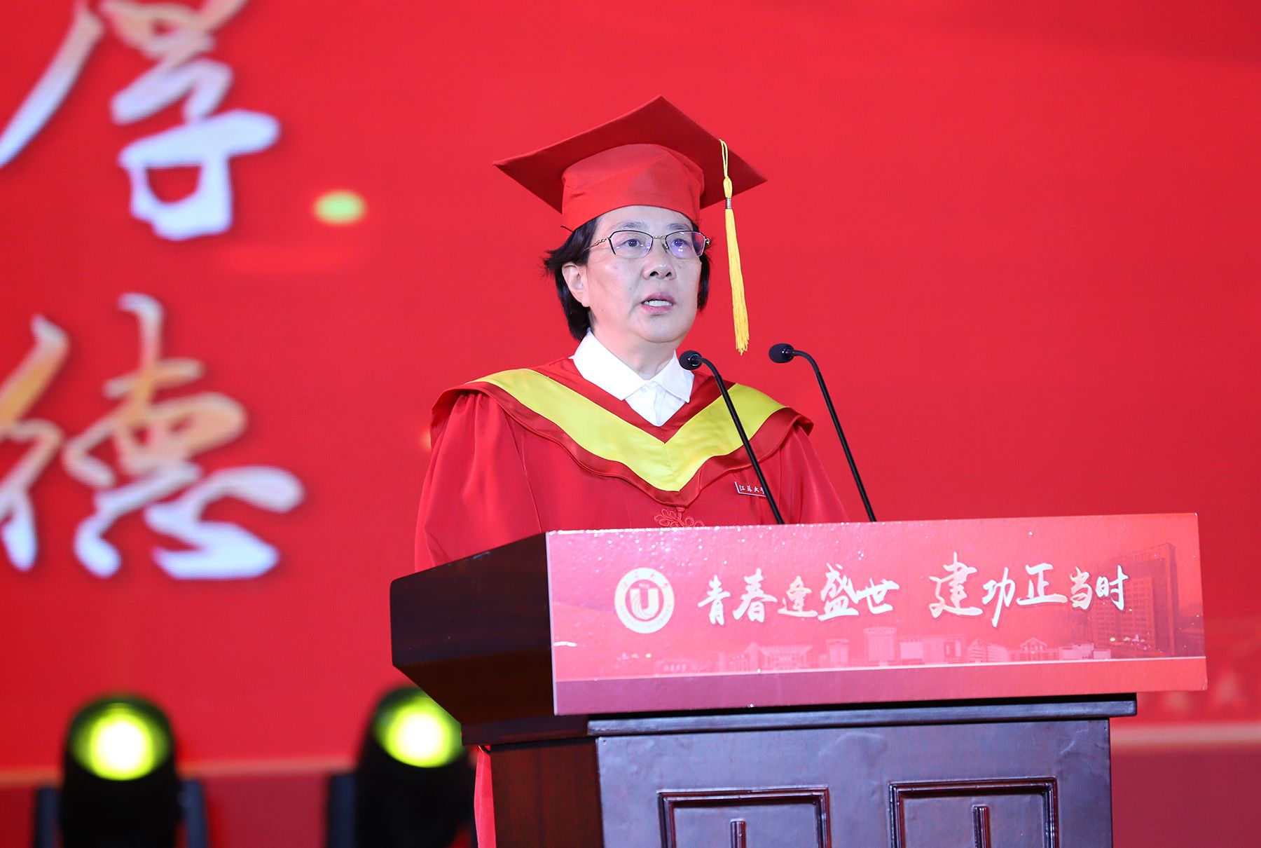 校长邢卫红发表题为《青春不设限 未来更无限》的讲话。她代表学校向即将踏上新征程的全体毕业生致以最热烈的祝贺。邢卫红在讲话中深情寄语,充分肯定毕业生们在校取得的优异成绩,鼓励同学们继续与伟大时代同向同行,在更广阔的天地绽放更大的荣光。邢卫红说,在开云(中国),2024届毕业生们刻下了青春的记忆和模样、积攒了前行的底气和力量,走出了不平凡的足迹,递交了优秀的成绩单。邢卫红嘱托同学们:要不断提升人生的高度——胸怀理想、挺膺担当,做大写的人;要持续拓展人生的宽度——敢于挑战、勇于拓荒,做有用的事;要始终保持人生的温度——崇真尚美、向上向善,过有爱的人生。邢卫红殷切希望每一位毕业生同学能够健康快乐、前程无限好,用自己喜欢的方式过好这一生,并祝愿大家能够不负时代、不负韶华,去开拓人生道路上的无限可能,在新征程上谱写开云(中国)人的荣耀与辉煌。