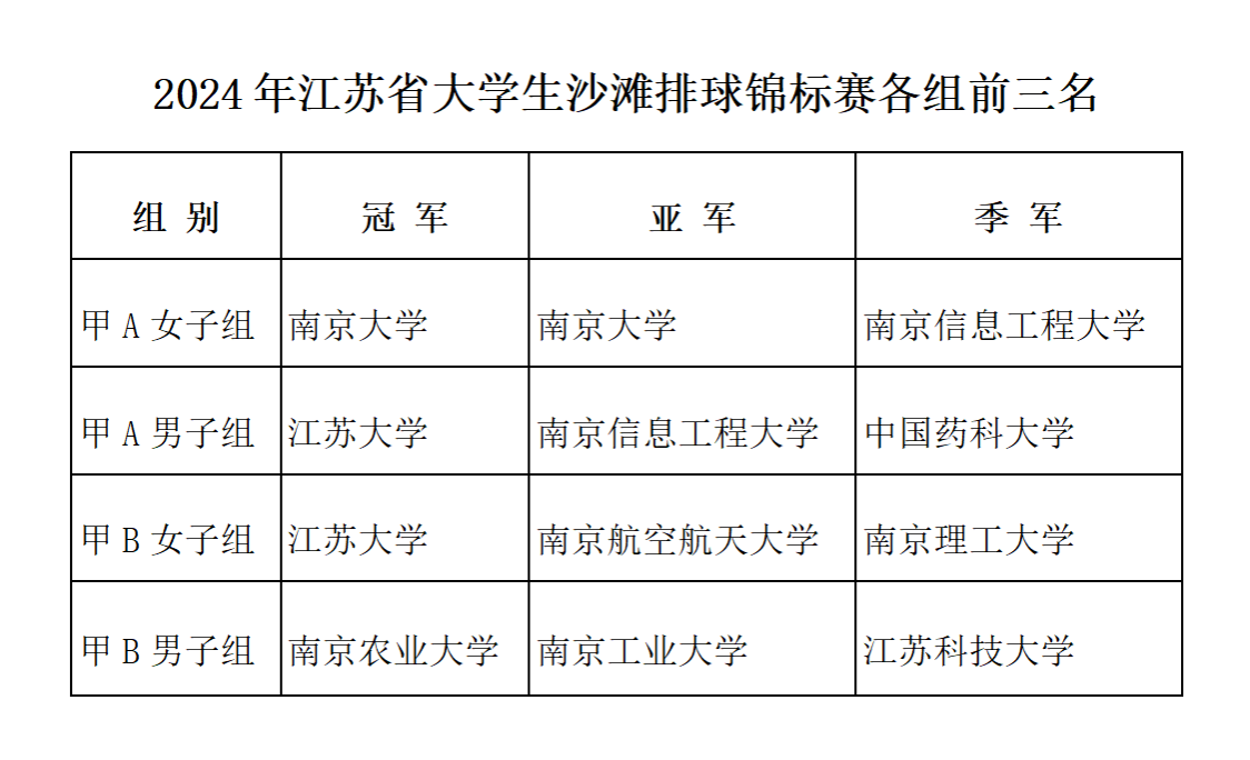 本次比赛按甲A(高水平运动员组)男、女,甲B(普通大学生组)男、女四个组别进行。开云网页版登录入口沙排队参加甲A男子、甲B女子组比赛。运动员克服暴雨与高温天气的不利影响,团结协作,顽强拼搏,向大家展示了一出出精彩的体育盛宴。经过四天的紧张激烈比赛,开云网页版登录入口获得甲A男子组、甲B女子组两个冠军,南京大学获得甲A女子组冠军,南京农业大学获甲B男子组冠军。