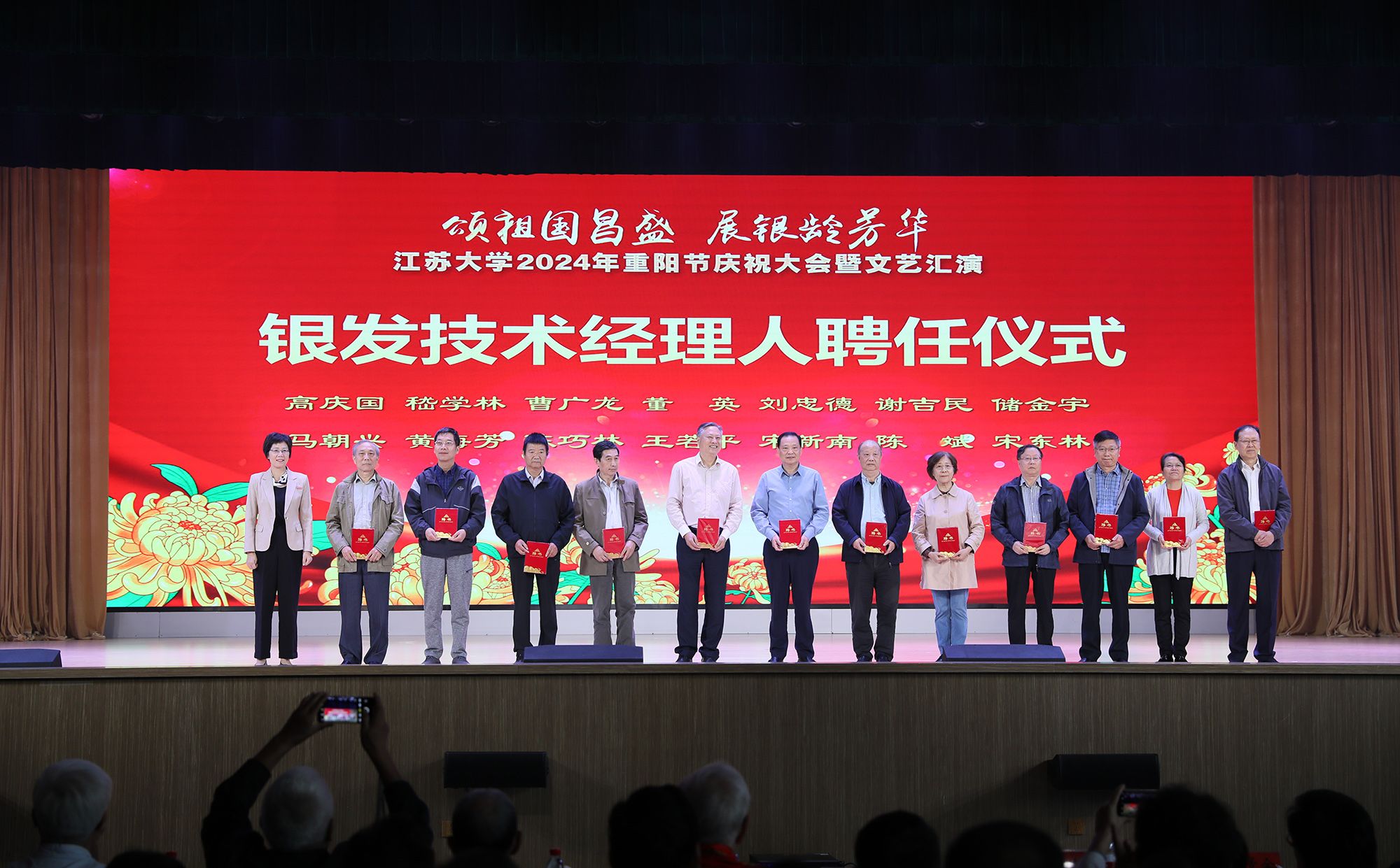 14名退休教师受聘为学校技术经理人,助力校地产学研合作。李红为银发技术经理人代表颁发聘书。
