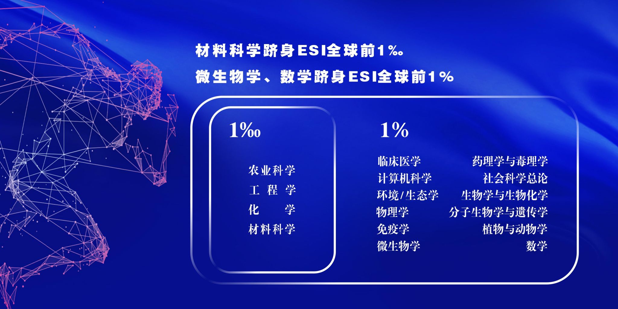 ESI全球排名前1‰学科+1,前1%学科+2。2024年,我校材料科学跻身ESI全球前千分之一学科,微生物学、数学跻身ESI全球前百分之一学科,ESI前千分之一学科数达4个,前百分之一学科数达16个。农业科学由1月的0.426‰上升至0.291‰,排名由全球52位上升至38位;工程学由1月的0.351‰提升至0.269‰,排名由全球84位上升至70位。学校ESI综合影响力全球排名第369位,较2023年提升75位,中国大陆高校排名第40位。