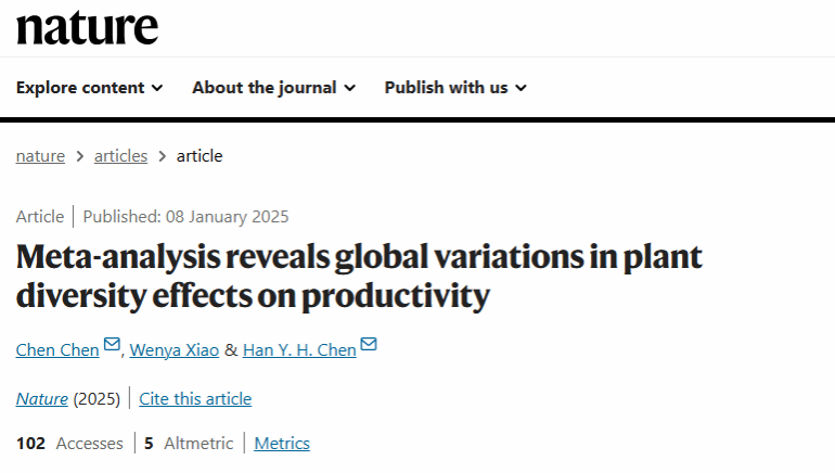 近日,国际顶级学术期刊《自然》(Nature)发表了题为Meta-analysis reveals global variations in plant diversity effects on productivity的研究论文。该论文由加拿大湖首大学(Lakehead University)、开云网页版登录入口及中国科学院植物研究所等多家单位联合完成。中科院植物研究所副研究员陈晨为论文第一作者,开云网页版登录入口环安学院副教授肖文娅为论文第二作者,陈晨与加拿大湖首大学教授Han Y.H. Chen为论文共同通讯作者。