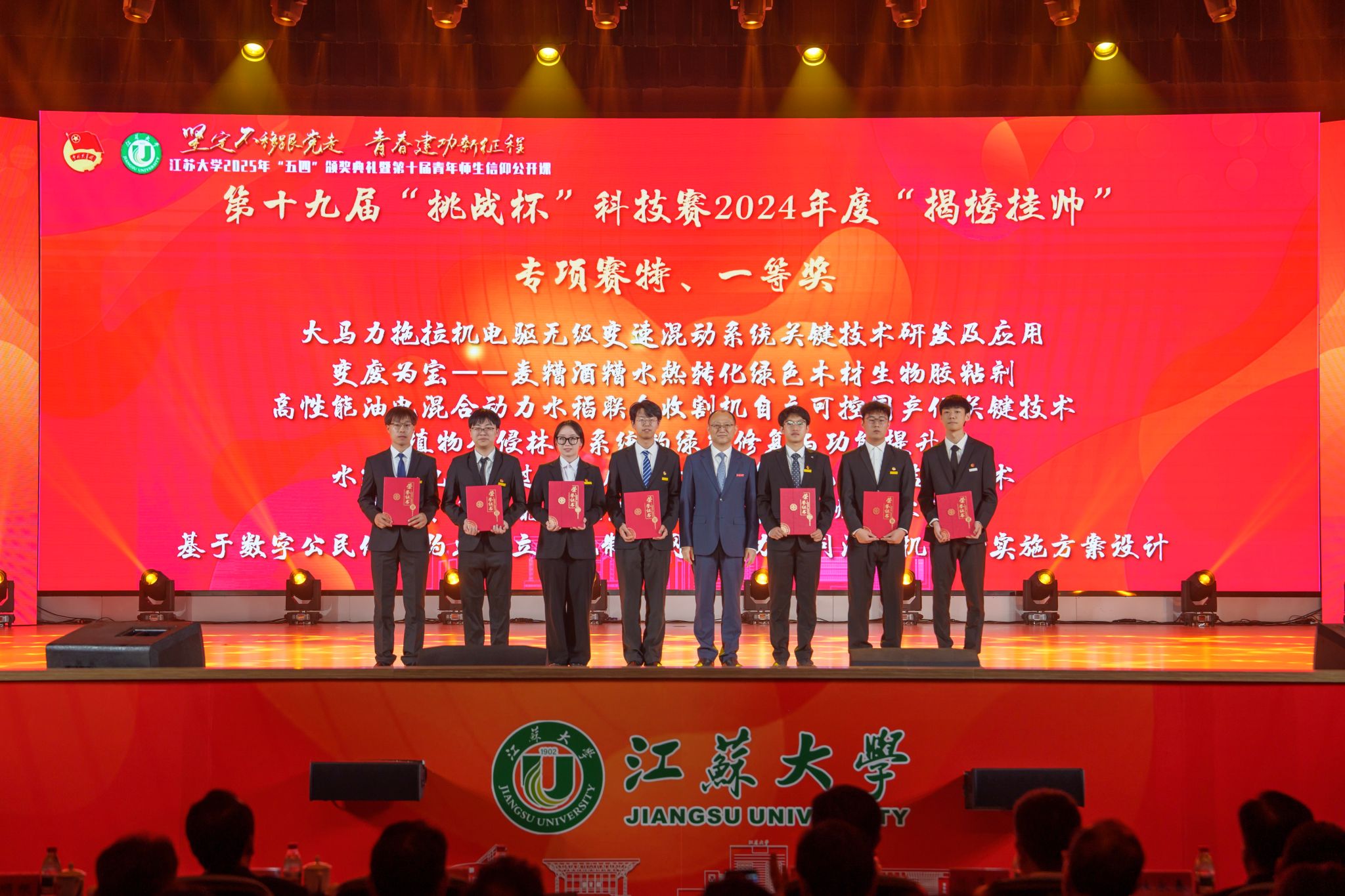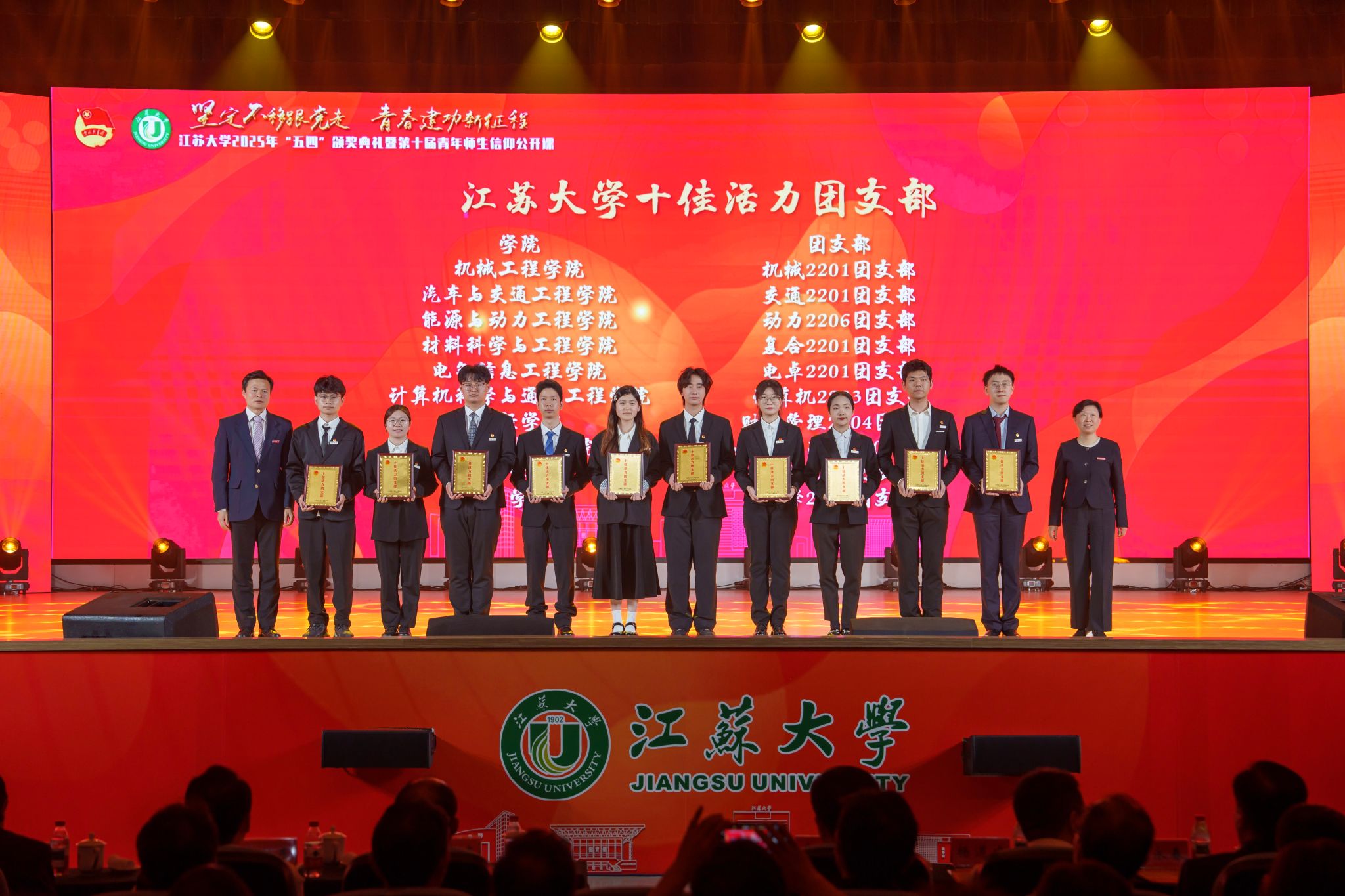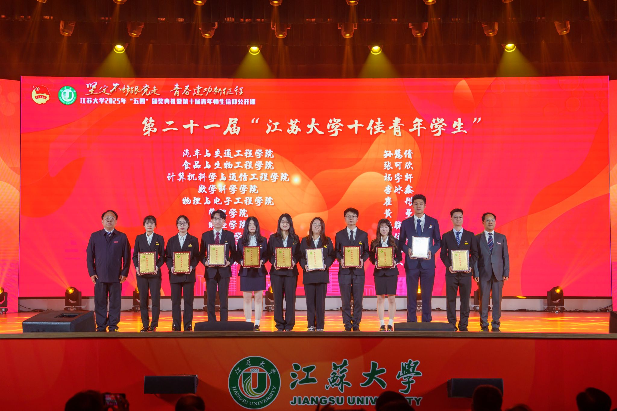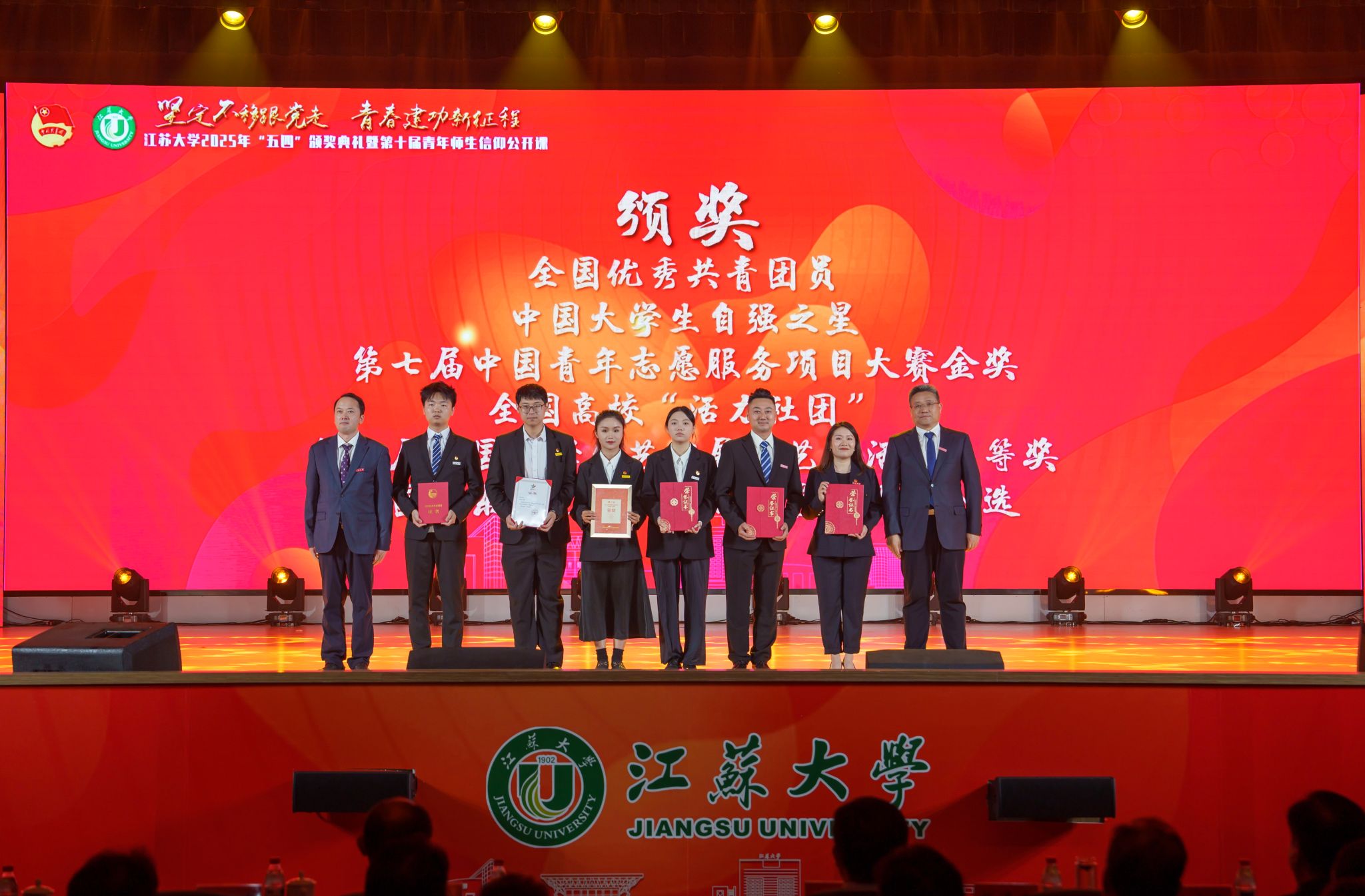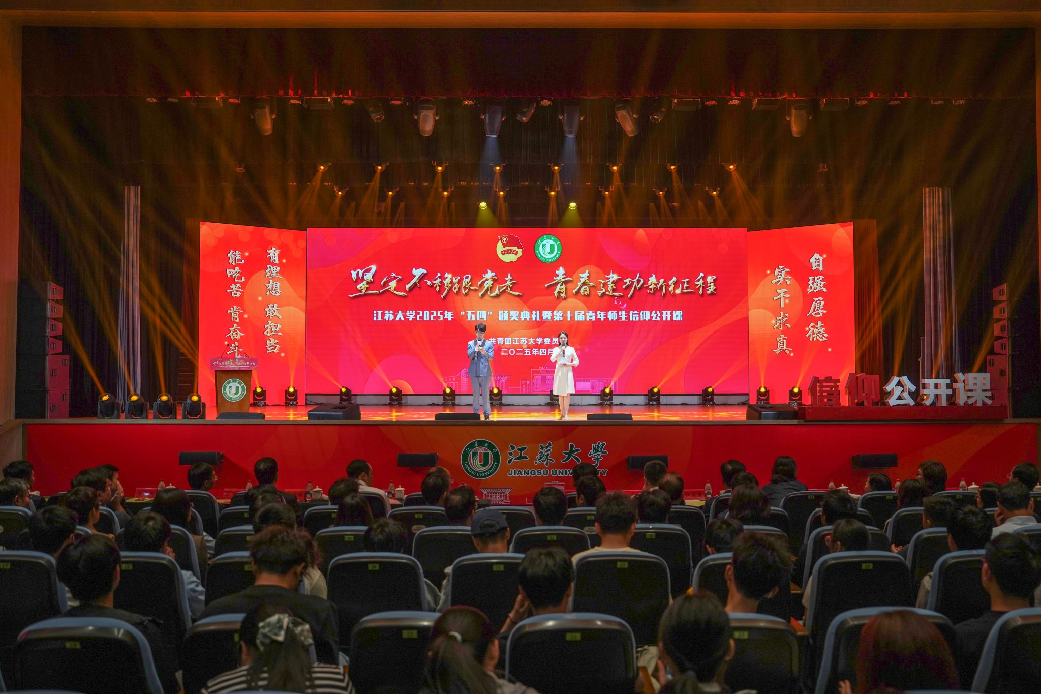 典礼现场,大学生艺术团表演舞蹈《为了万家灯火》,农业工程学院王亮辉同学带来TED演讲《青春聚力 星河共燃》,教师教育学院专硕23级团支部带来风采展示《如愿》,流体机械工程技术研究中心青年教师周岭带来青年教师说《奋斗的青春最美丽》,大学生艺术团表演舞蹈《接班人》。大学生艺术团献演的原创音诗画作品《夜空中最亮的星》引发强烈共鸣,作品聚焦“科学家精神”主题,以“中国应用语言学之母”“两弹一星”元勋郭永怀的夫人李佩(镇江籍)为创作原型,讲述了她在三尺讲台托举无数科研梦想故事。
