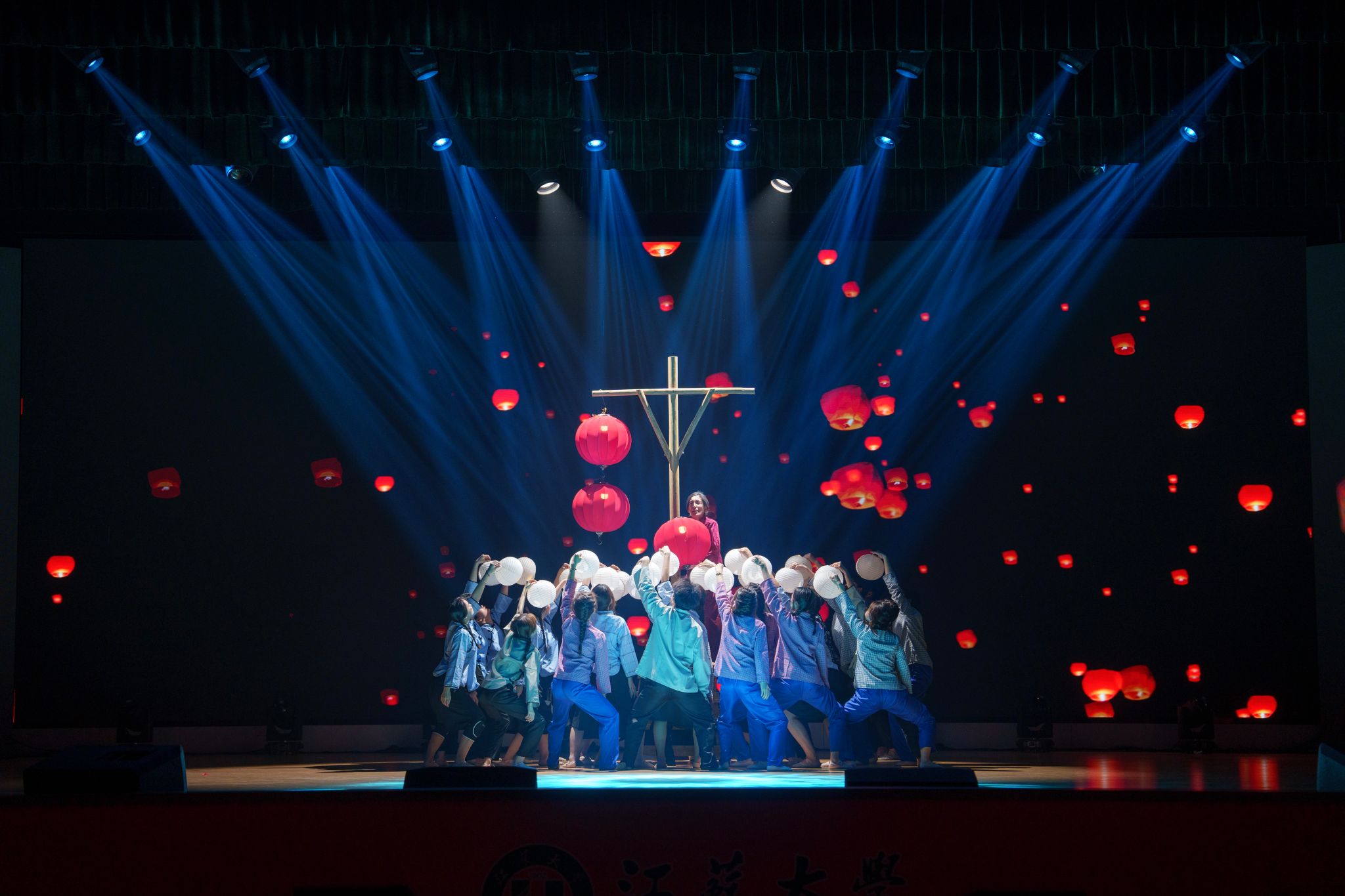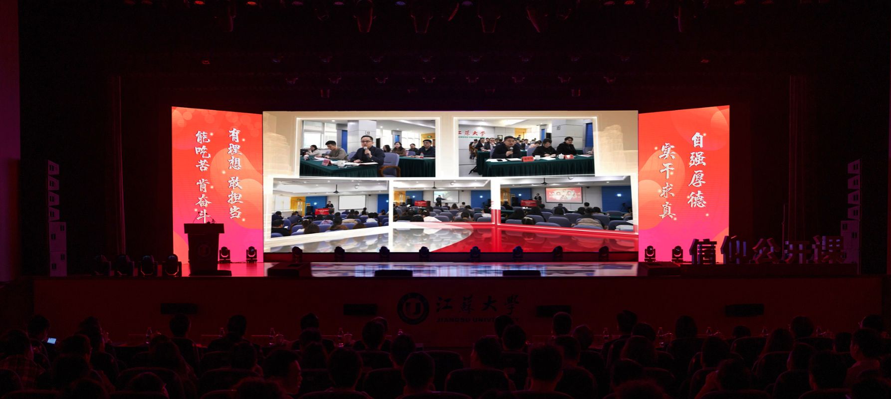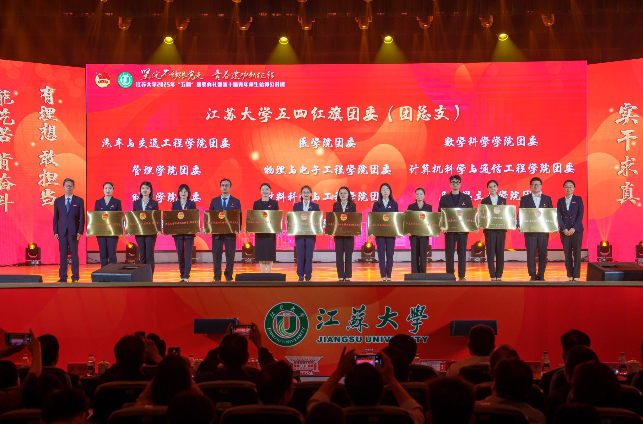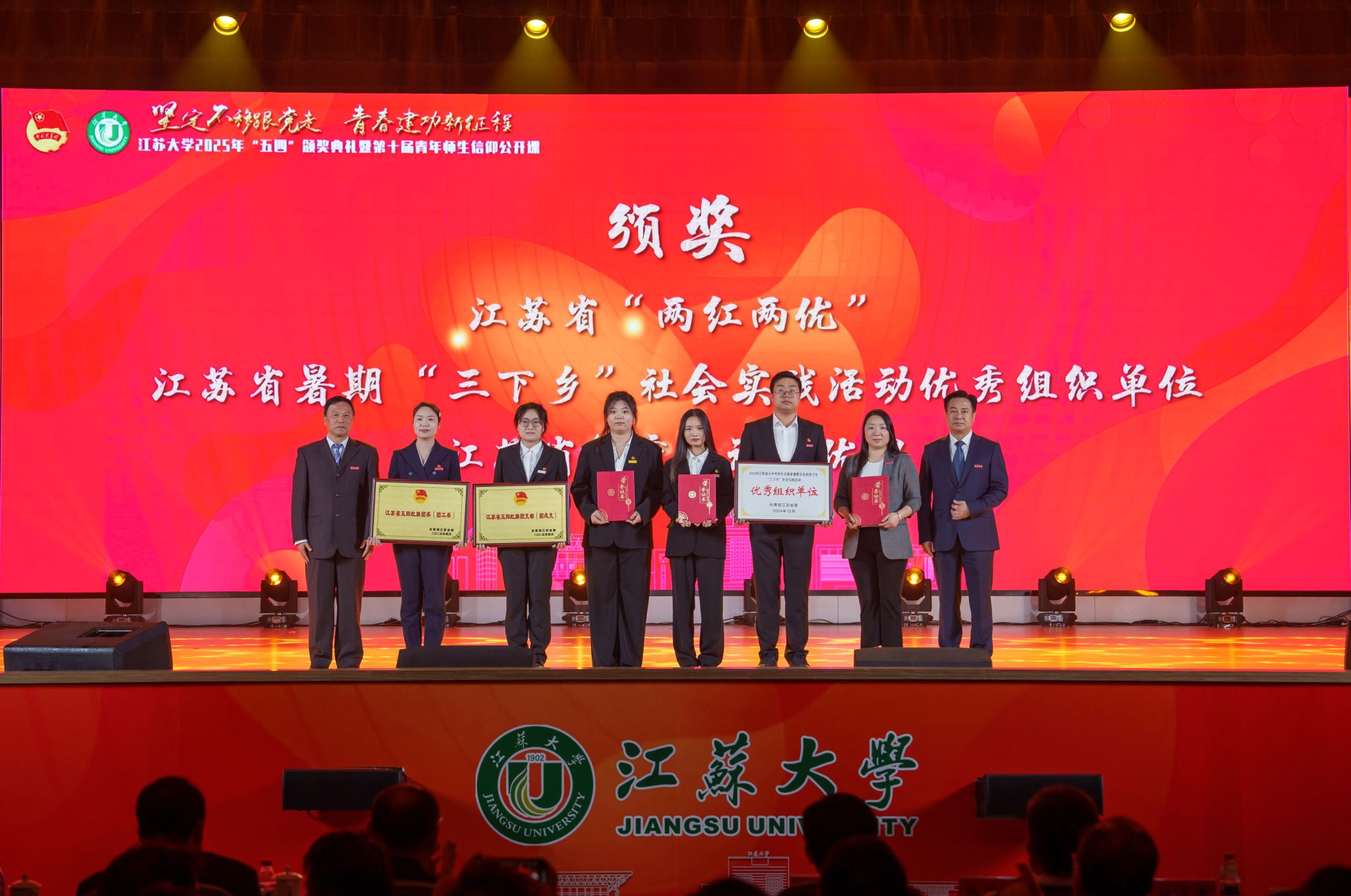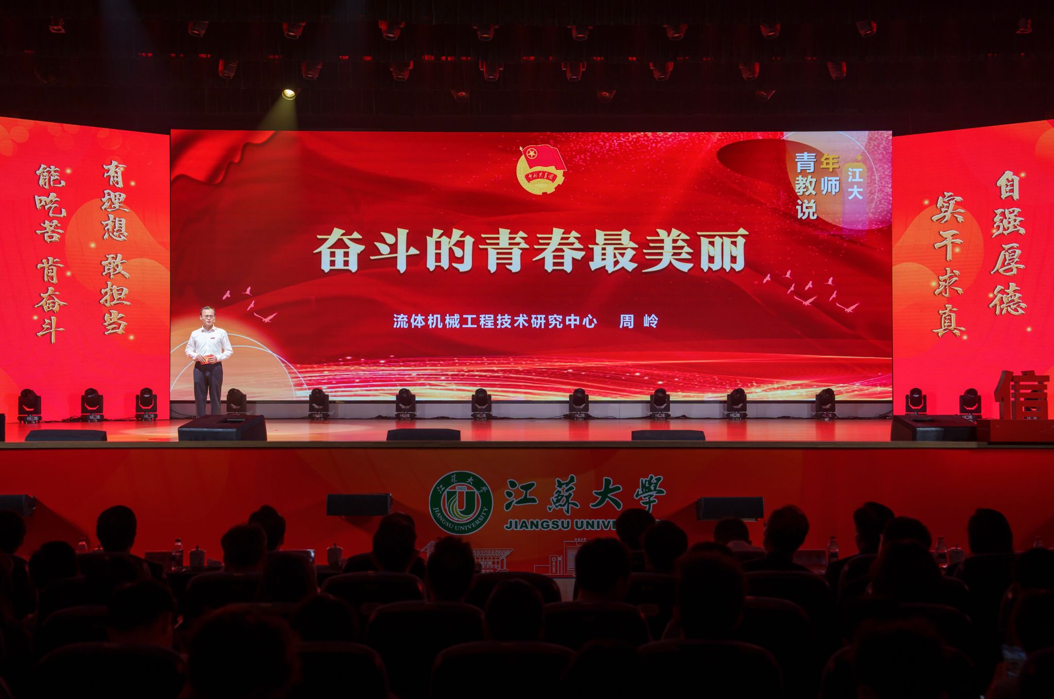 典礼现场,大学生艺术团表演舞蹈《为了万家灯火》,农业工程学院王亮辉同学带来TED演讲《青春聚力 星河共燃》,教师教育学院专硕23级团支部带来风采展示《如愿》,流体机械工程技术研究中心青年教师周岭带来青年教师说《奋斗的青春最美丽》,大学生艺术团表演舞蹈《接班人》。大学生艺术团献演的原创音诗画作品《夜空中最亮的星》引发强烈共鸣,作品聚焦“科学家精神”主题,以“中国应用语言学之母”“两弹一星”元勋郭永怀的夫人李佩(镇江籍)为创作原型,讲述了她在三尺讲台托举无数科研梦想故事。