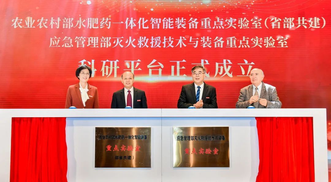 在科研平台揭牌仪式上,颜晓红、李红共同为农业农村部水肥药一体化智能装备重点实验室(部省共建)揭牌,校党委书记袁寿其、杰·博华共同为应急管理部灭火救援技术与装备重点实验室揭牌。
