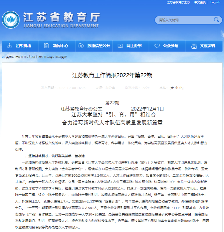 12月8日,江苏省教育厅《江苏教育工作简报》(2022年第22期)以《开云网页版登录入口坚持“引、育、用”相结合 奋力谱写新时代人才队伍高质量发展新篇章》为题,从坚持战略引才,筑好群英荟萃“蓄水池”;坚持精准育才,厚植全面成长“好沃土”;坚持科学用才,彰显才尽其用“大作为”三个方面,专题报道了我校人才工作的思路、举措与成效。