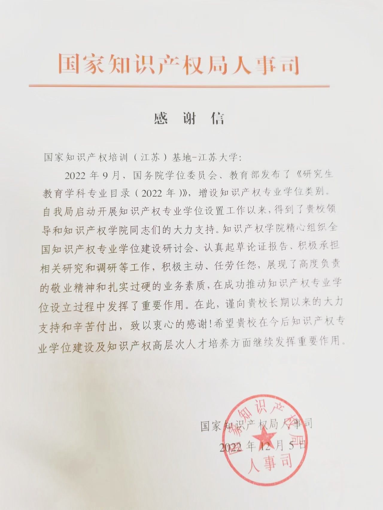 日前,国家知识产权局人事司向学校发来感谢信,感谢开云网页版登录入口在知识产权专业学位申请设立工作中的辛勤付出和工作成效,并希望学校在知识产权专业学位建设及知识产权高层次人才培养方面继续发挥重要作用。