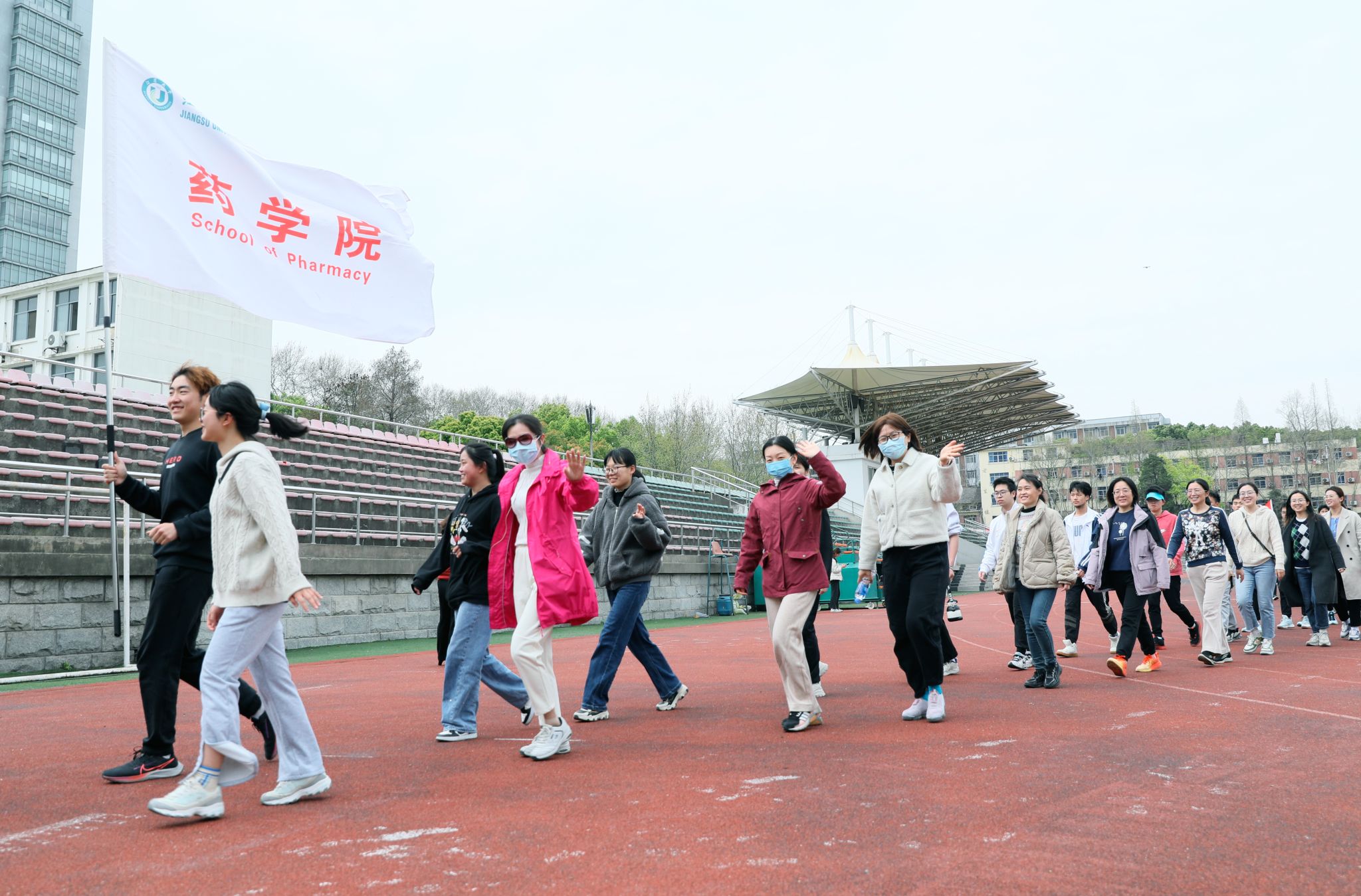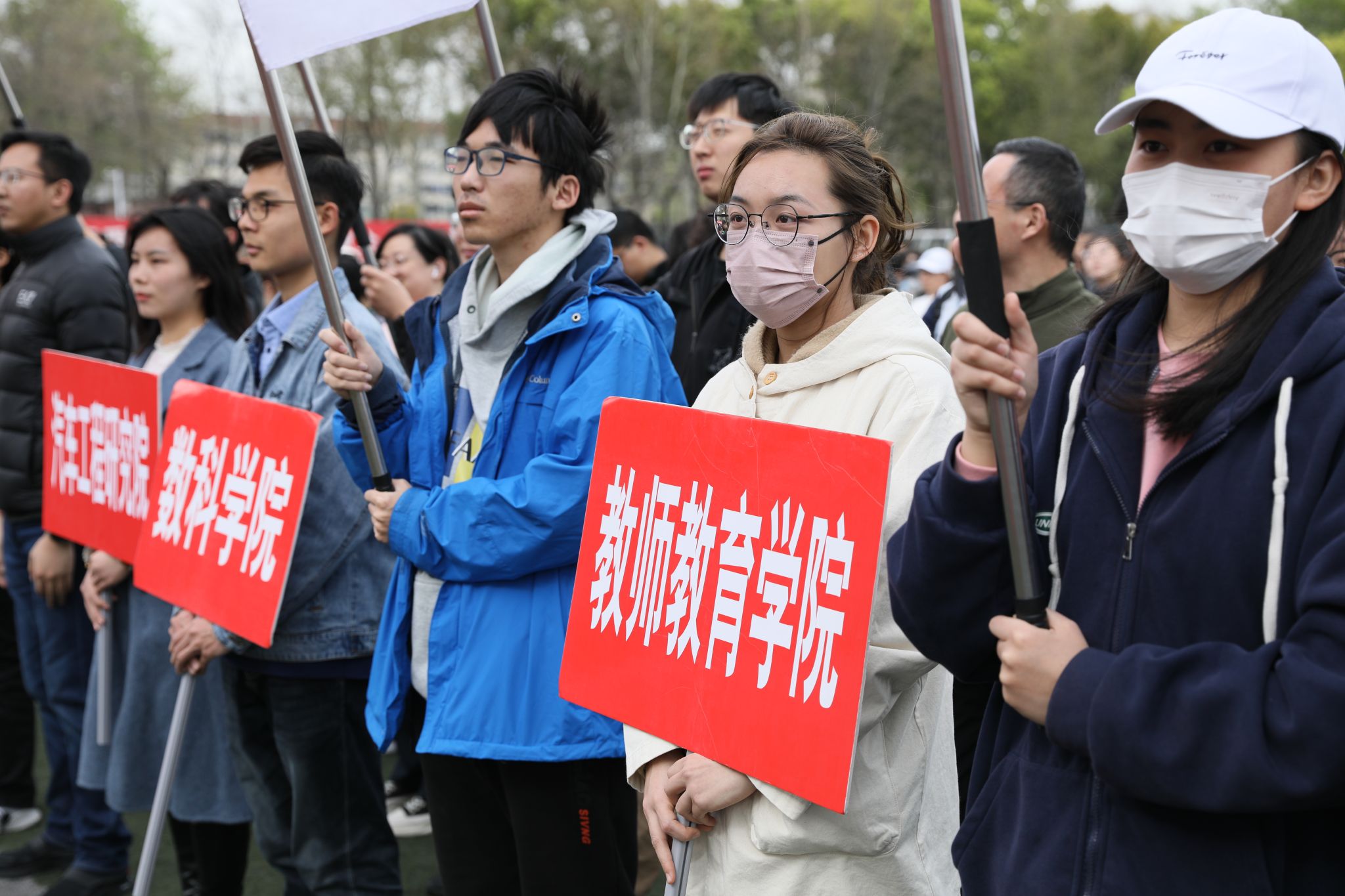 学院及机关人员组成的40个方阵、1200多名师生,高举旗帜,精神抖擞,在沿途大学生志愿者的引导下,完成校园环线健步走。