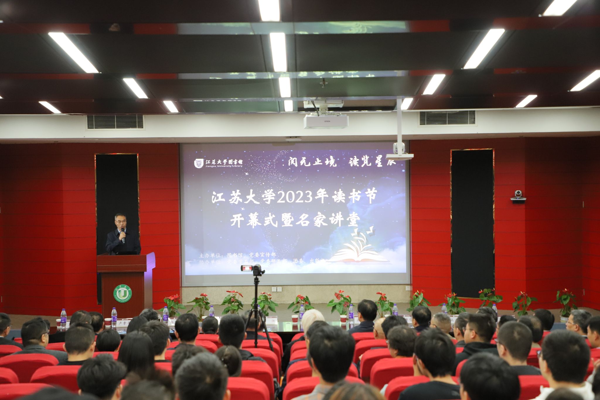 4月22日,学校2023年“读书节”活动在图书馆一楼报告厅拉开帷幕,主题为“阅无止境,读览星辰”。镇江市政协副主席、副校长陈红,财政部驻江苏专员办原监察专员、江苏省政府参事蔡润及其夫人武颖,镇江市文旅产业集团总经理蒋云峰,校党委常委、宣传部部长杨道建,江苏省政府参事卢章平,央视“百家讲坛”主讲人、陕西师范大学教授于赓哲,镇江市作家协会原主席王川,镇江市作家协会主席蔡永祥及各界文化名人出席开幕式。校职能部门负责人、学院以及相关二级党组织书记、来自全校各学院的200余名师生参加开幕式。开幕式由图书馆党委书记张明平主持。