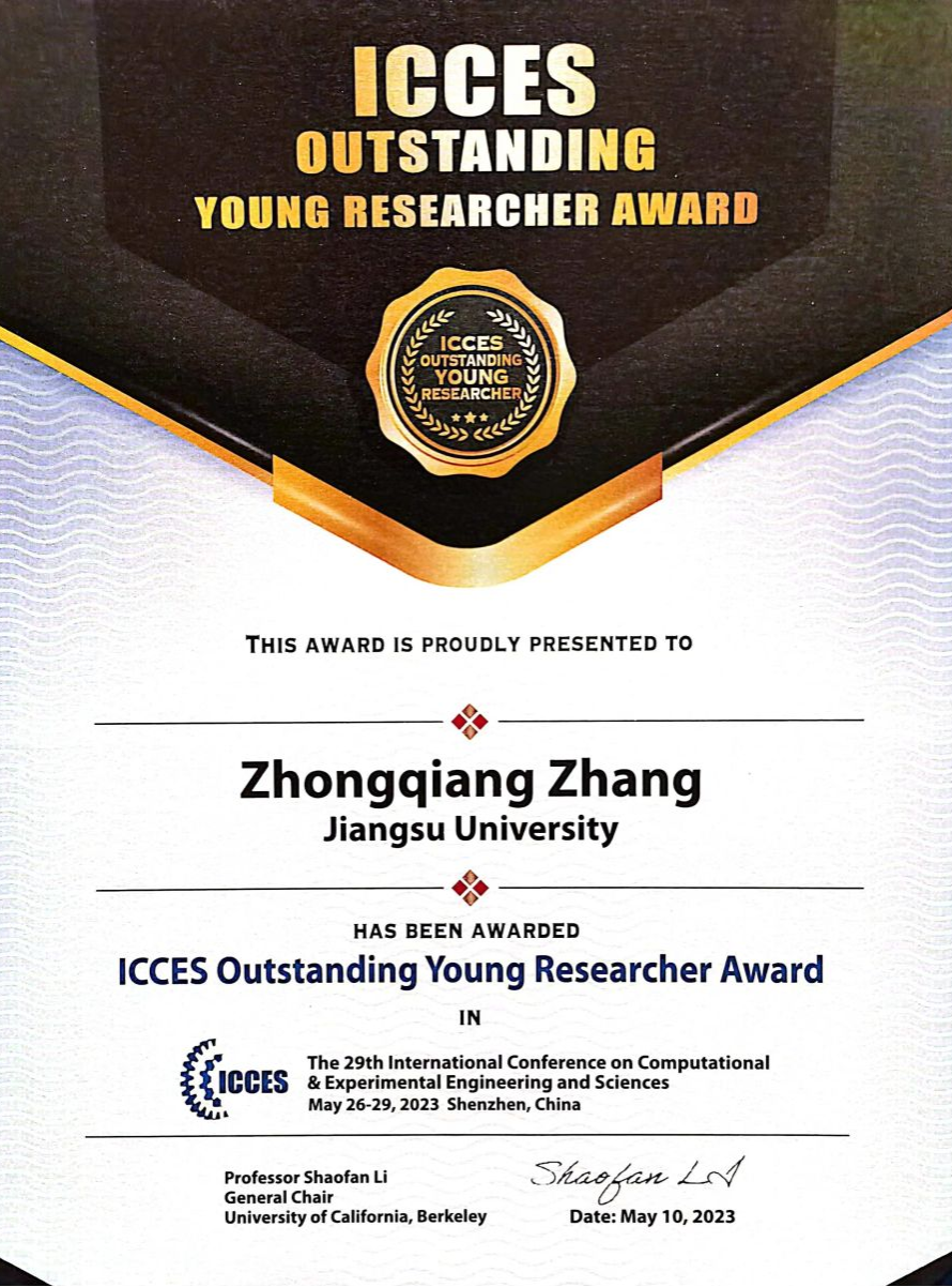本次会议经计算与实验科学工程国际会议委员会推举、评选,开云网页版登录入口张忠强教授、上海交通大学张律文教授、南京航空航天大学殷俊教授、华中科技大学肖蜜教授、河海大学傅卓佳教授等5位青年学者荣获ICCES杰出青年学者奖,哈尔滨工程大学张阿漫教授为五位获奖者颁奖。
