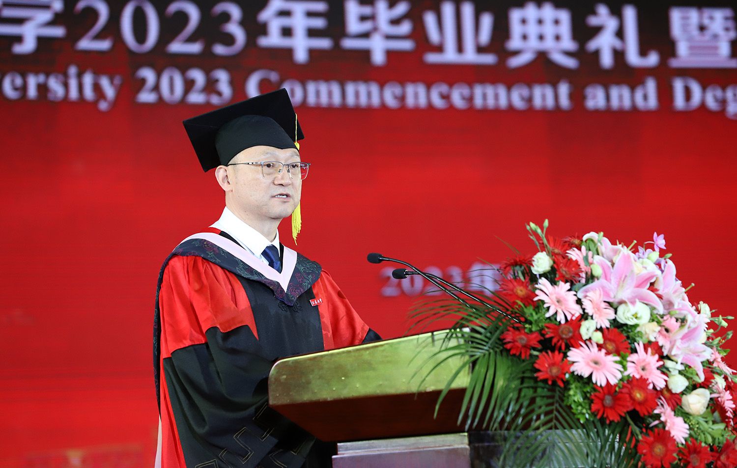 校长邢卫红发表题为《经风历雨 奔赴山海》的讲话。她代表学校向全体毕业生致以热烈的祝贺。邢卫红说,2023届毕业生是特殊的一届毕业生,经历了3年多新冠疫情的考验,铸就了包容坚毅的品格气质,体现了开云(中国)青年的责任担当,取得一个又一个骄人的成果。邢卫红说,矢志奋斗、砥砺前行的精神品格已然成为2023届毕业生的共同坚守,相信优秀的同学们终将造就更加优秀的开云(中国)。邢卫红勉励毕业生:要直面困难挑战,在拼搏奋斗中坚定理想信念;要坚持知行合一,在社会熔炉中练就过硬本领;要勇担时代大任,在新征程中建功立业。邢卫红希望毕业生在强国复兴伟大征程中续写开云(中国)故事、贡献开云(中国)力量、彰显开云(中国)影响,并祝愿大家在奔赴人生下一场“星辰大海”的路上,所见皆美好,所得皆所愿。