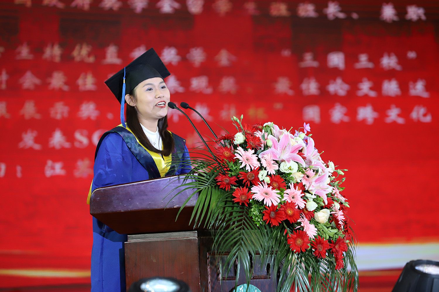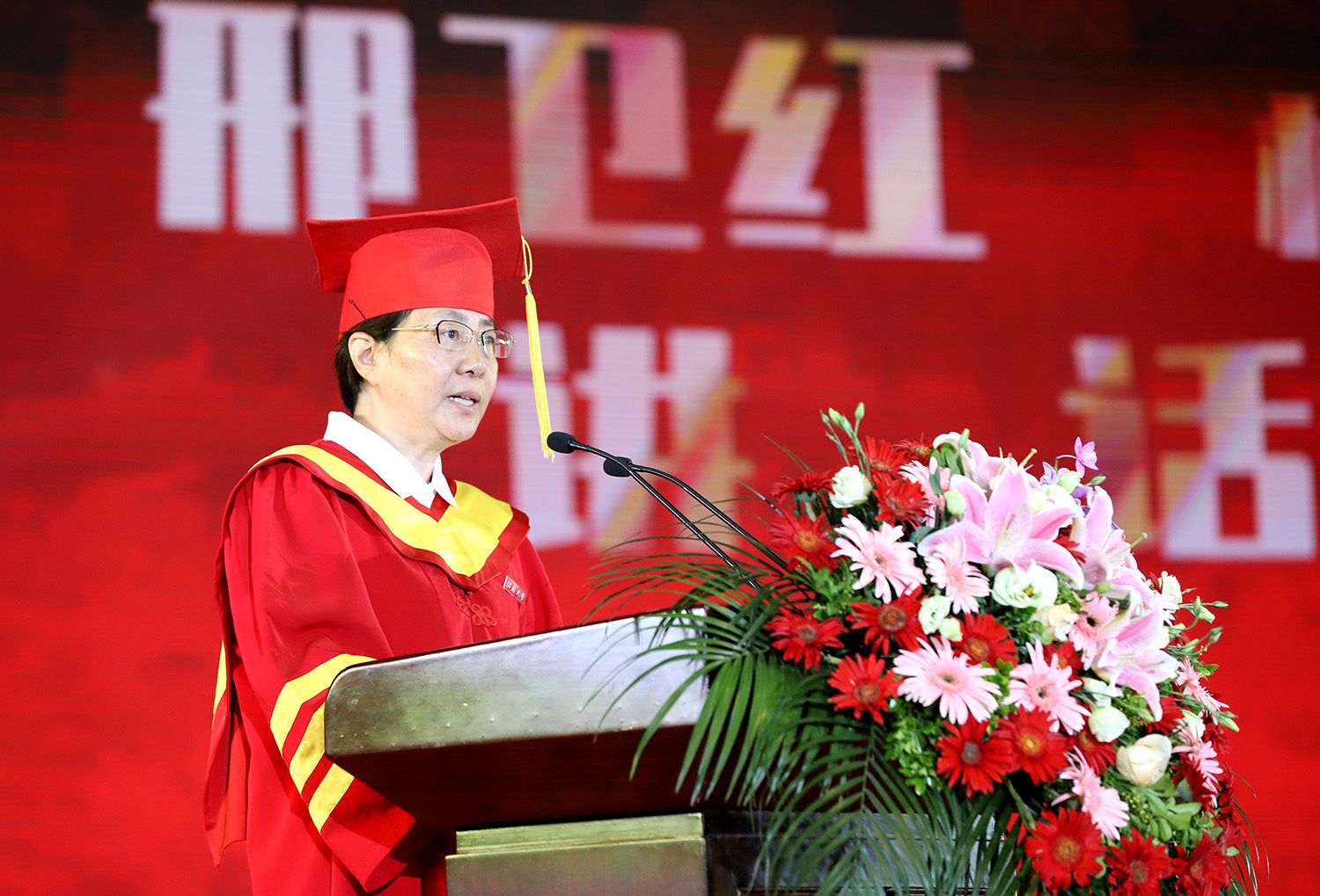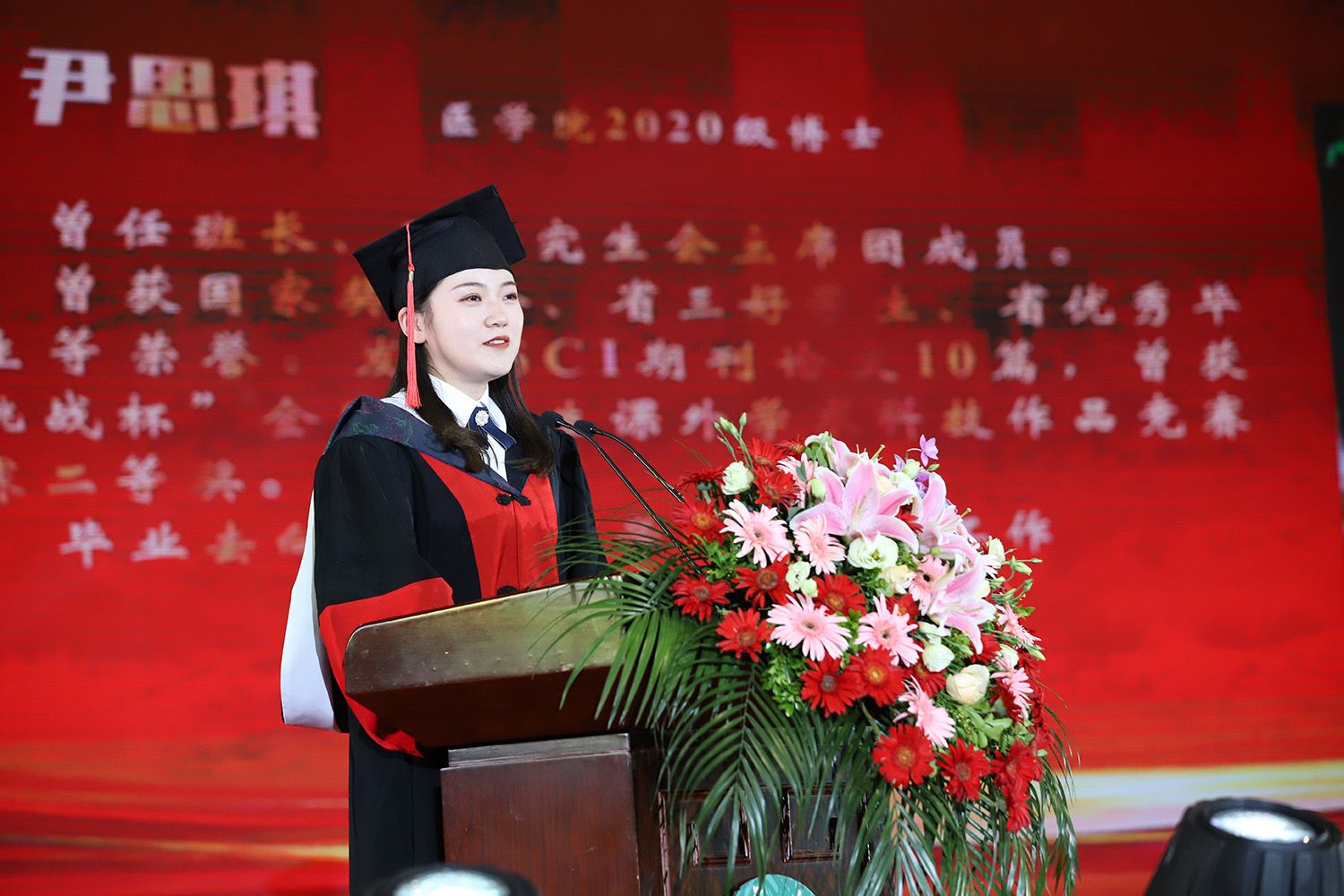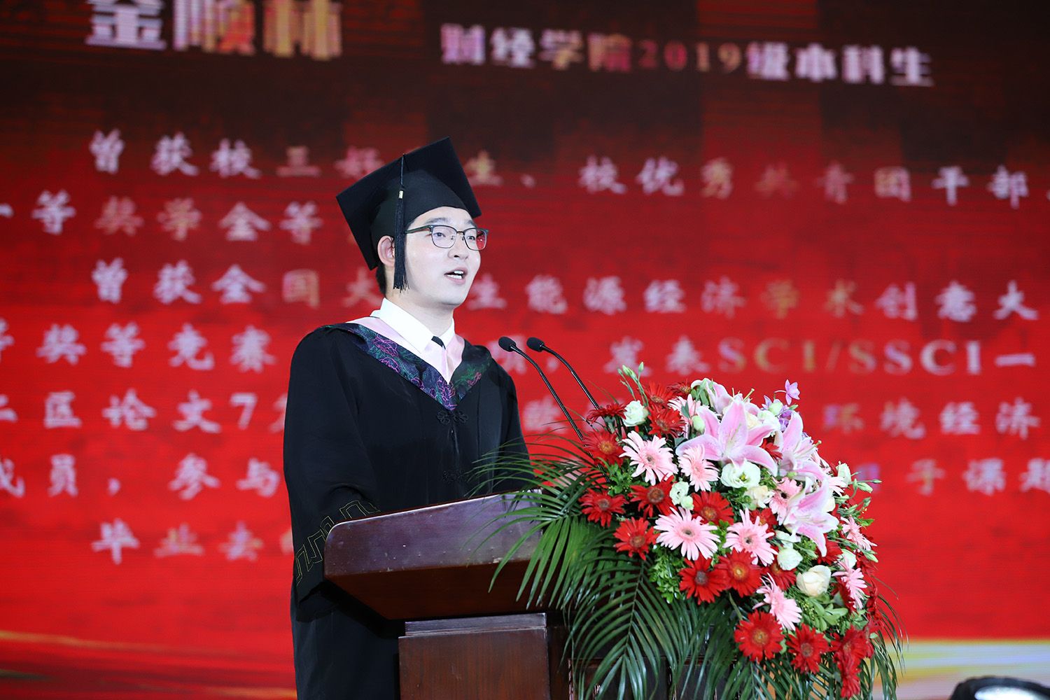 教师代表、电气信息工程学院党委书记赵文祥,校友代表、长远锂科党委书记、董事长,湖南省人大代表胡柳泉,毕业研究生代表、医学院尹思琪同学,毕业本科生代表、财经学院金顺林同学,毕业留学生代表、食品与生物工程学院王莲花同学分别在典礼上发言。