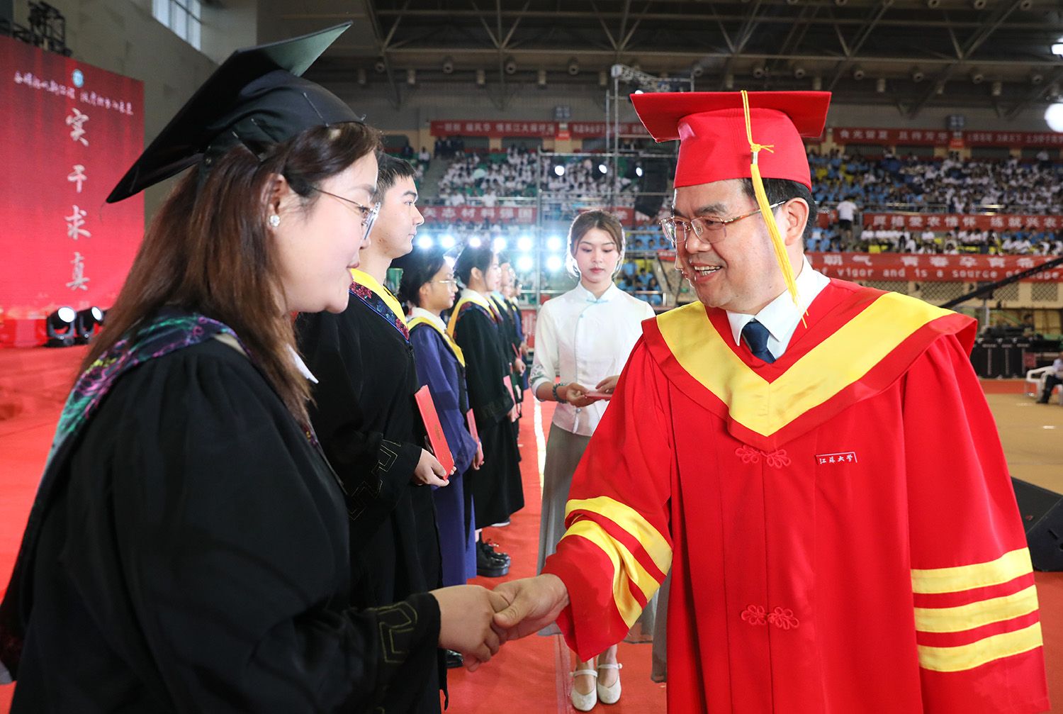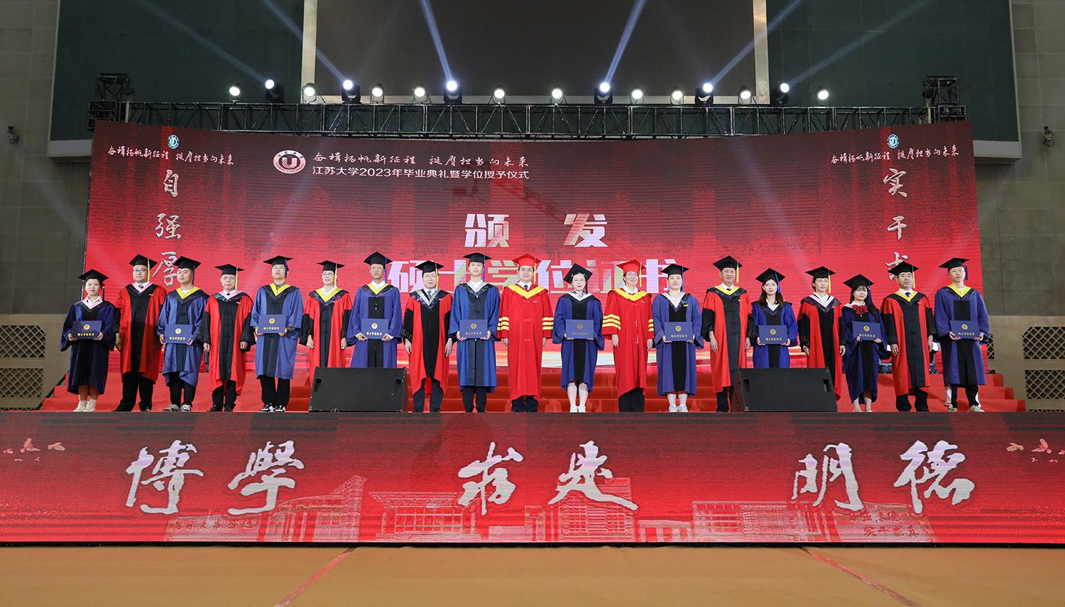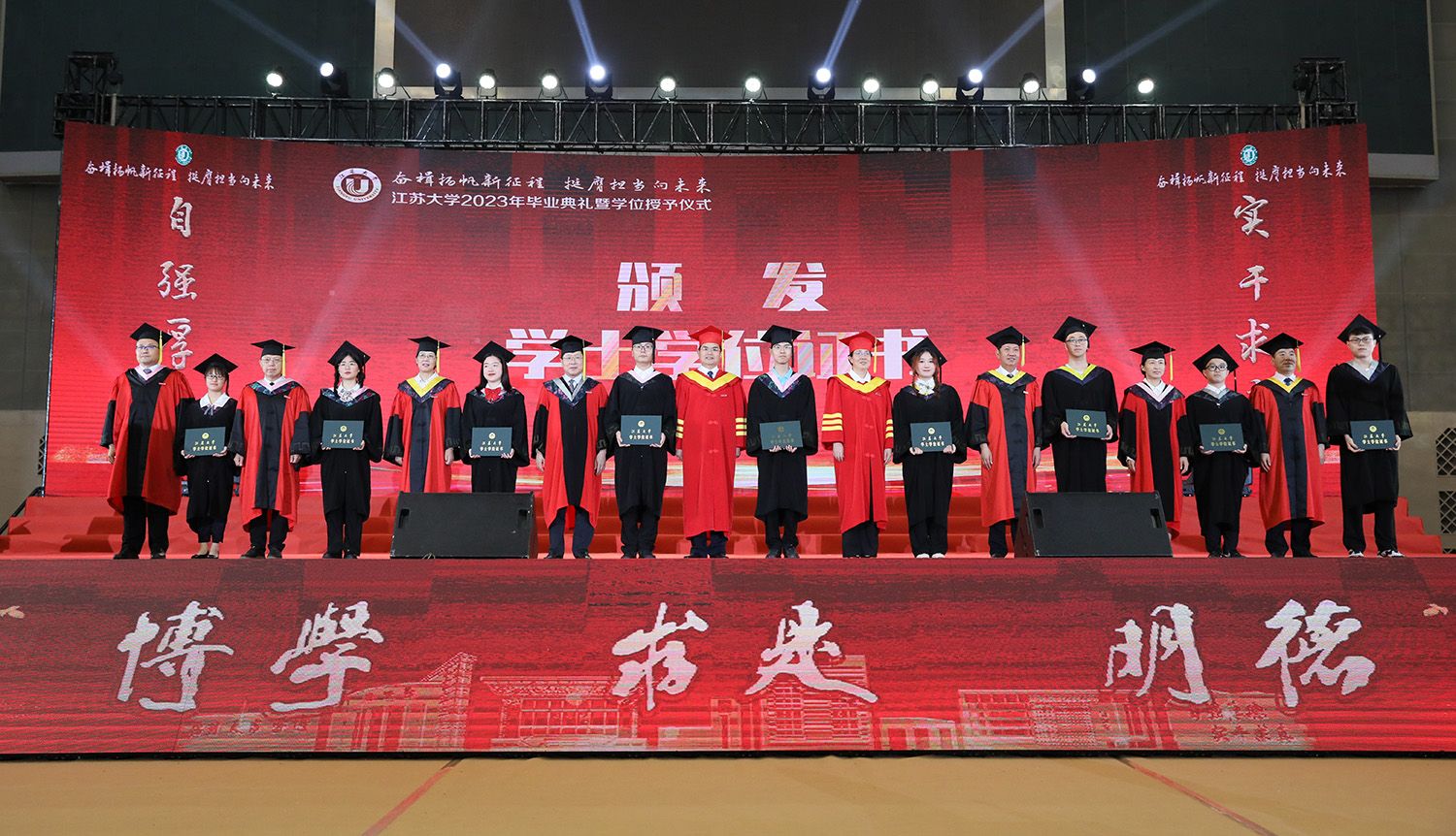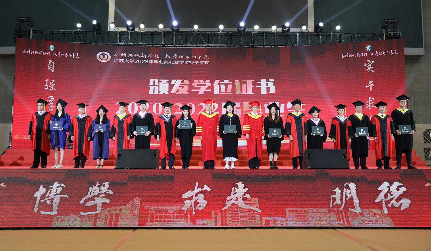 在学位授予仪式上,校领导、校党委常委为博士、硕士、学士学位代表颁发学位证书并扶正流苏。部分因疫情错过线下毕业典礼的2020、2021、2022届毕业生重返母校,校领导、校党委常委为他们颁发学位证书并扶正流苏。校党委书记李洪波为优秀毕业生代表颁发荣誉证书。
