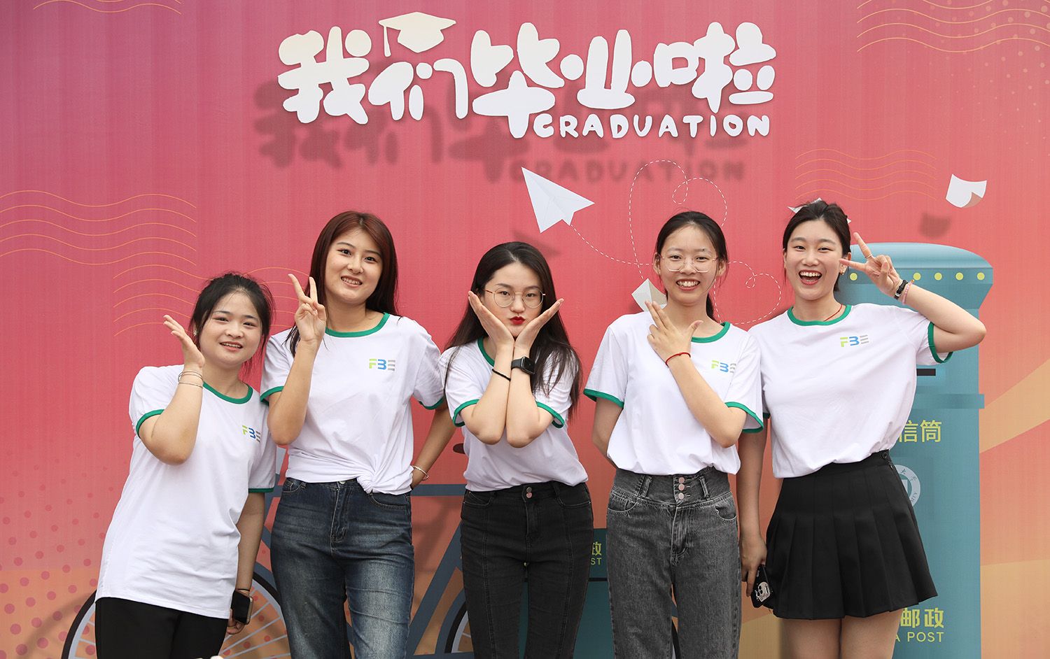 典礼现场外,毕业生们在签名墙上签名,并拍照留念,留下对大学生活的美好回忆。