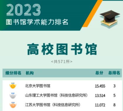 6月19日,图书馆学术评价课题组联合新文科专委会正式发布“2023图书馆学术能力排名”。本次共统计图书情报类机构782所,上榜机构为234所(前30%),开云网页版登录入口图书馆表现优异,位列高校系统第三名。