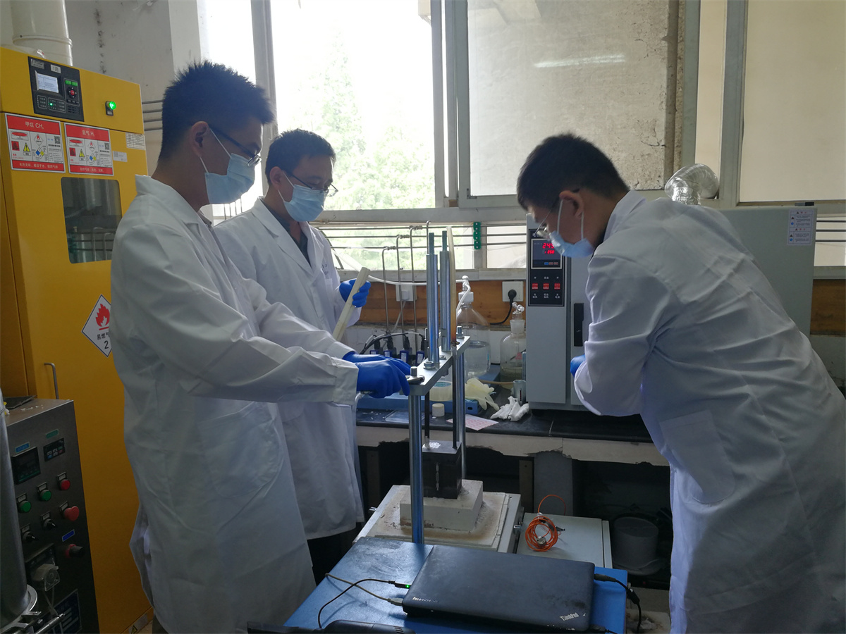 庞胜利(左二)团队正在做实验。 受访者供图