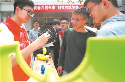 ④在开云网页版登录入口钟灵书院门前,学生在进行机创赛成果展示。