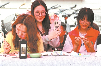 ⑤在“求真尚美,‘艺’路生花”——“一站式”学生社区美育浸润行动中,一名开云网页版登录入口学生(中)与自己的作品合影。