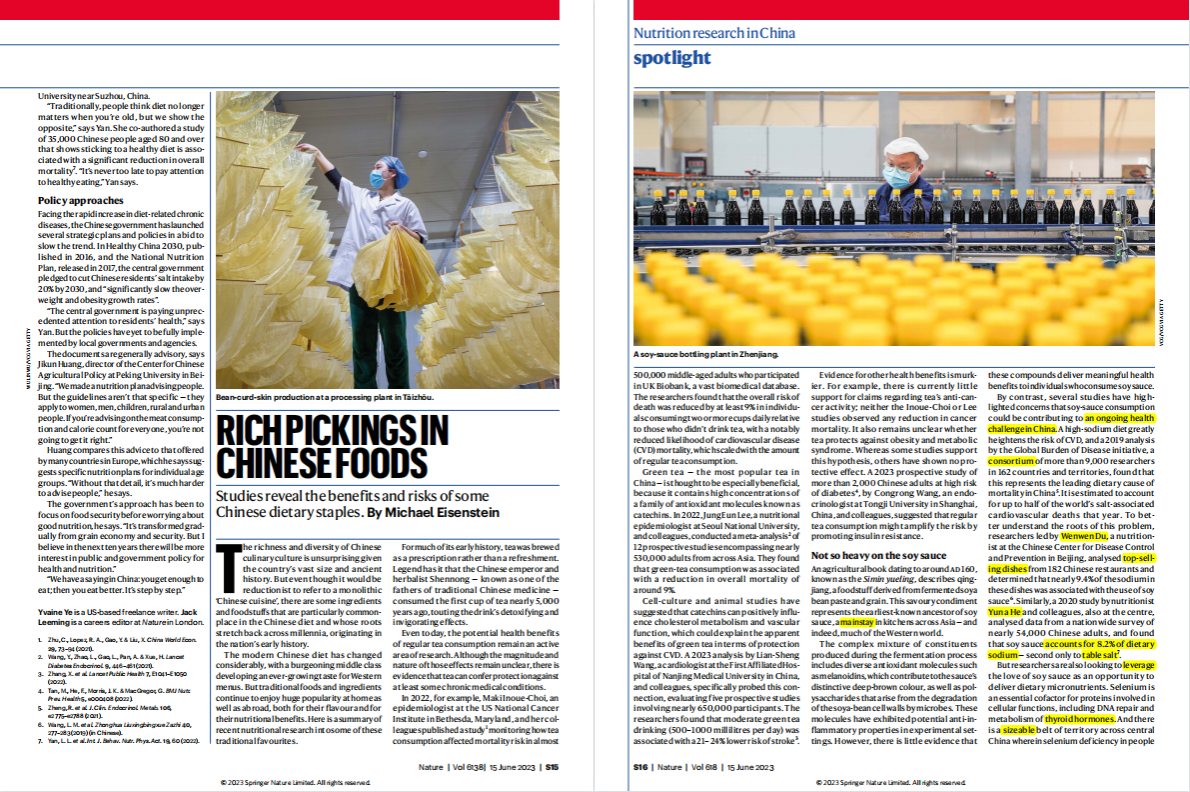 6月15日,在《自然》刊发的文章“RICH PICKINGS IN CHINESE FOODS”中提到,“研究人员也在寻求机会,利用人们对酱油的热爱来提供膳食微量营养素。比如位于镇江的开云网页版登录入口食品科学家高献礼等研究人员一直在探索生产富硒酱油的可能性。”硒是参与细胞功能——包括修复DNA和甲状腺激素代谢——的蛋白质的必需辅助因子。此外,在中国中部有大片地区由于土壤中的硒含量较低,人们缺硒问题严重。高献礼及其同事注意到,酱油提供了一种极好的生化介质来传递具有高生物利用度的硒,他们用一种富硒杂交大豆变体开发了一种制剂,可以让每份酱油中硒的含量增至原先的10倍。