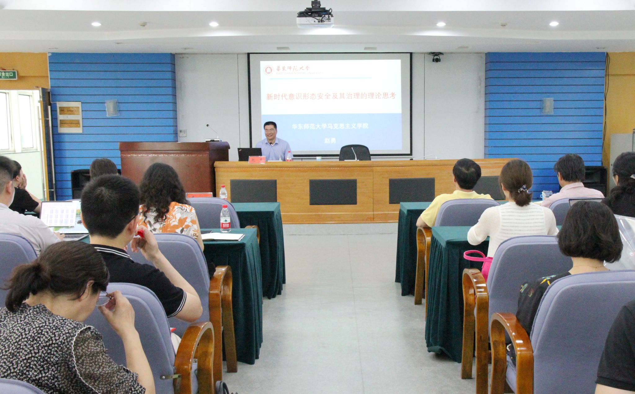 华东师范大学马克思主义学院副院长赵勇教授以《新时代意识形态安全及其治理的理论思考》为题,作了精彩纷呈的专题报告。全体与会教师分组进行集中学习和研讨交流。研讨后,小组代表靳媛媛、张林、戴迎华、高逸凡四位老师分别作大会交流发言。